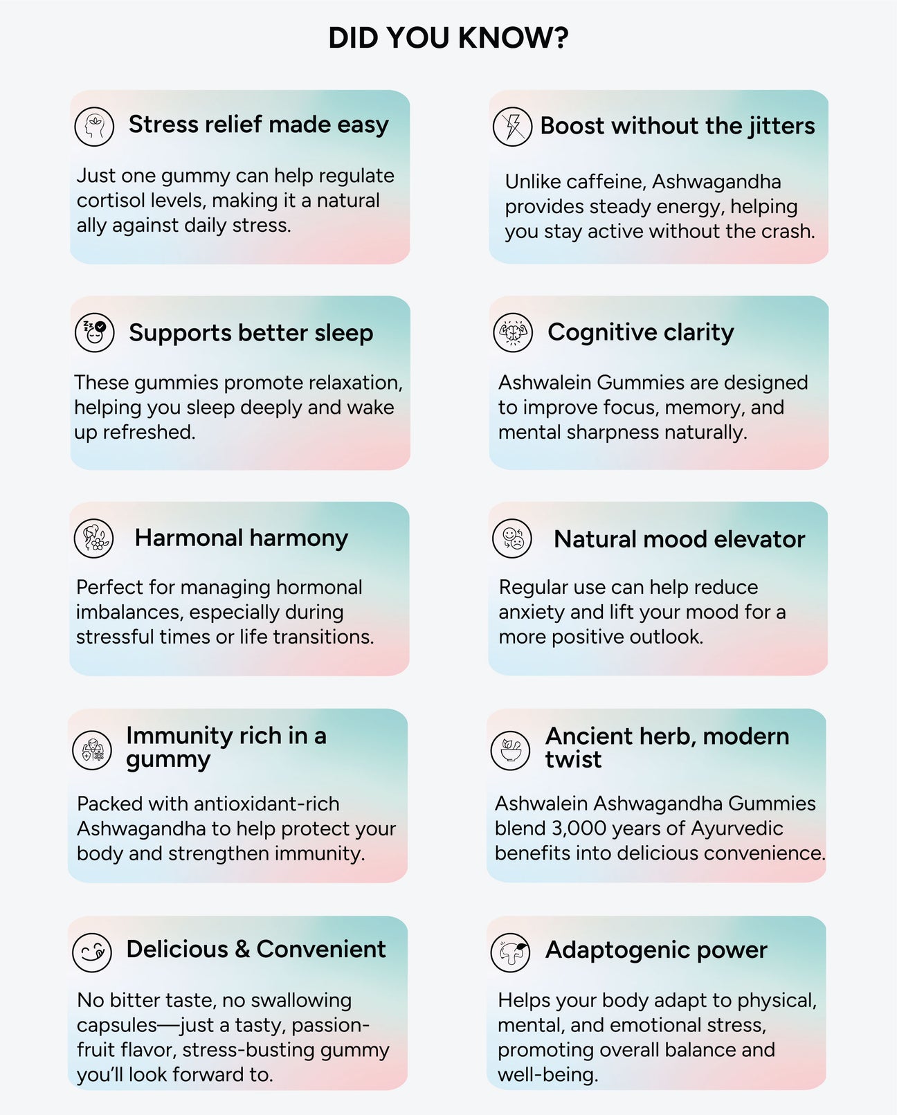 Ashwalein® is rich in active compounds that help you feel calmer, sleep better, boost your mood, and recover faster — so you're not just taking Ashwagandha, you're truly experiencing its benefits.