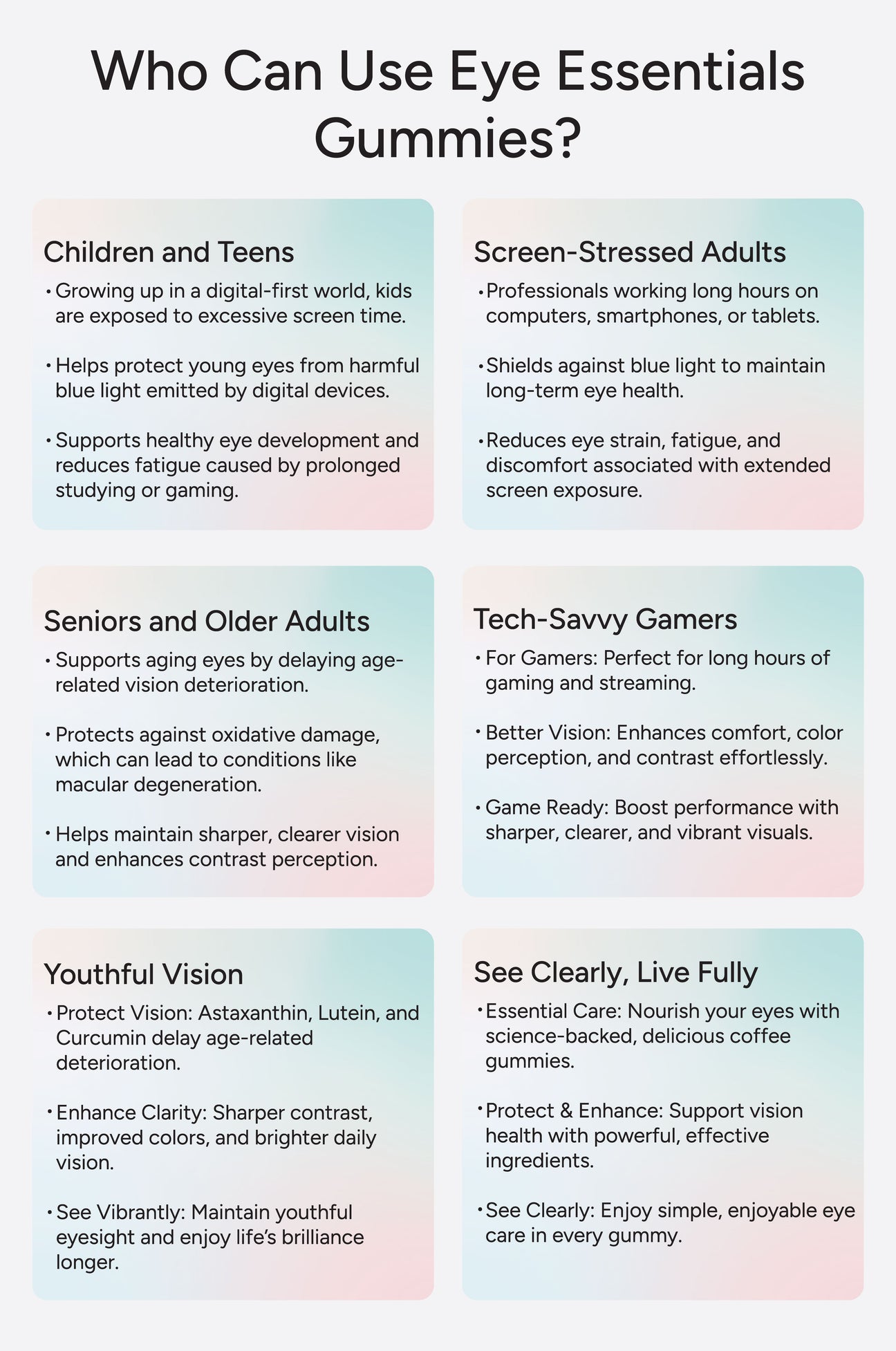 Whether you’re a professional gamer, a coding wizard, or a streaming enthusiast, your eyes work overtime to keep up. Eye Essentials Gummies are specifically designed to support prolonged screen-time demands. By reducing eye fatigue, improving contrast, and shielding your eyes from blue light, these gummies ensure that you stay sharp, focused, and comfortable through every game, work session, or movie marathon.