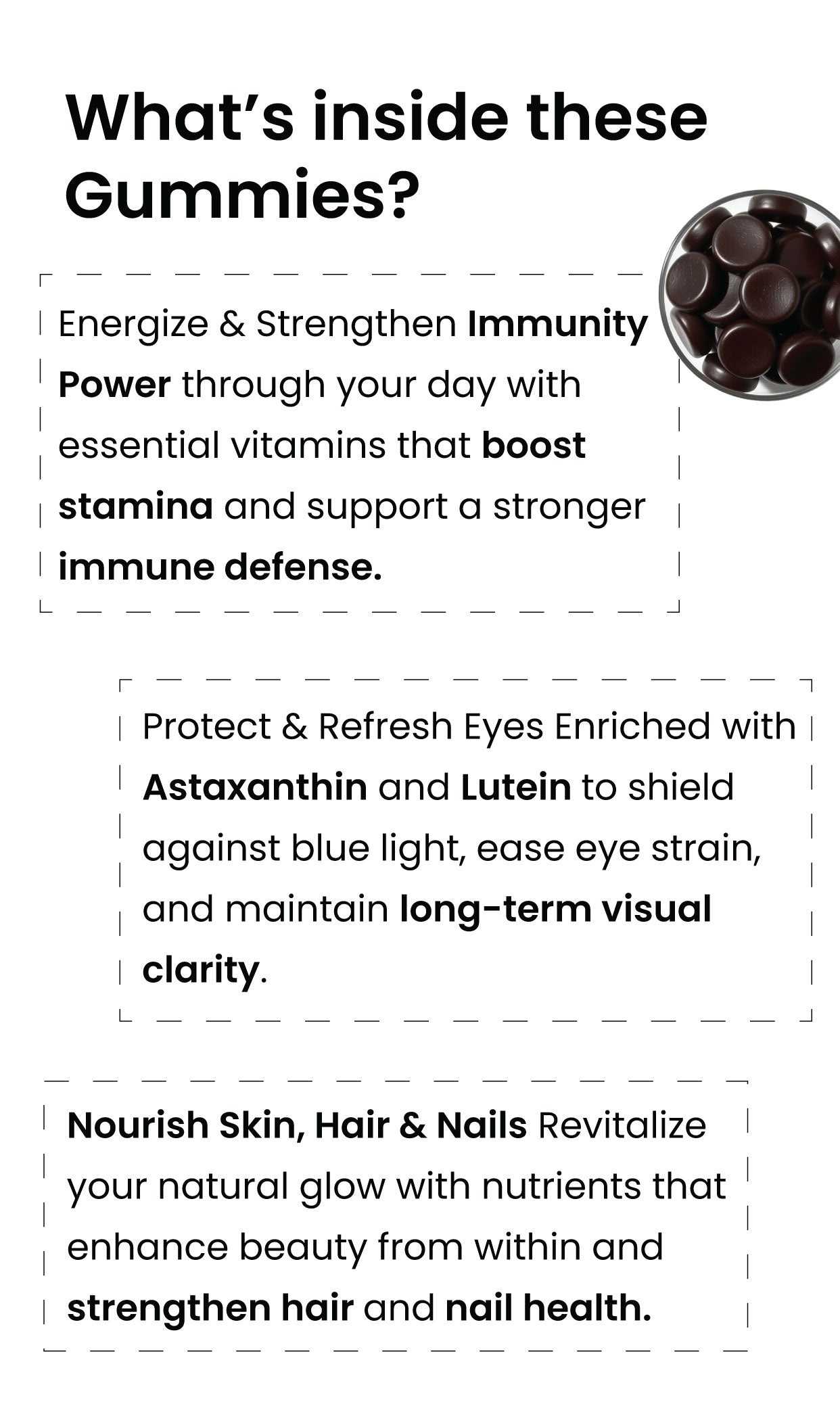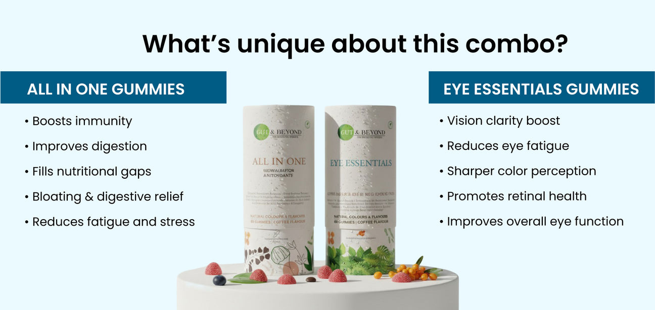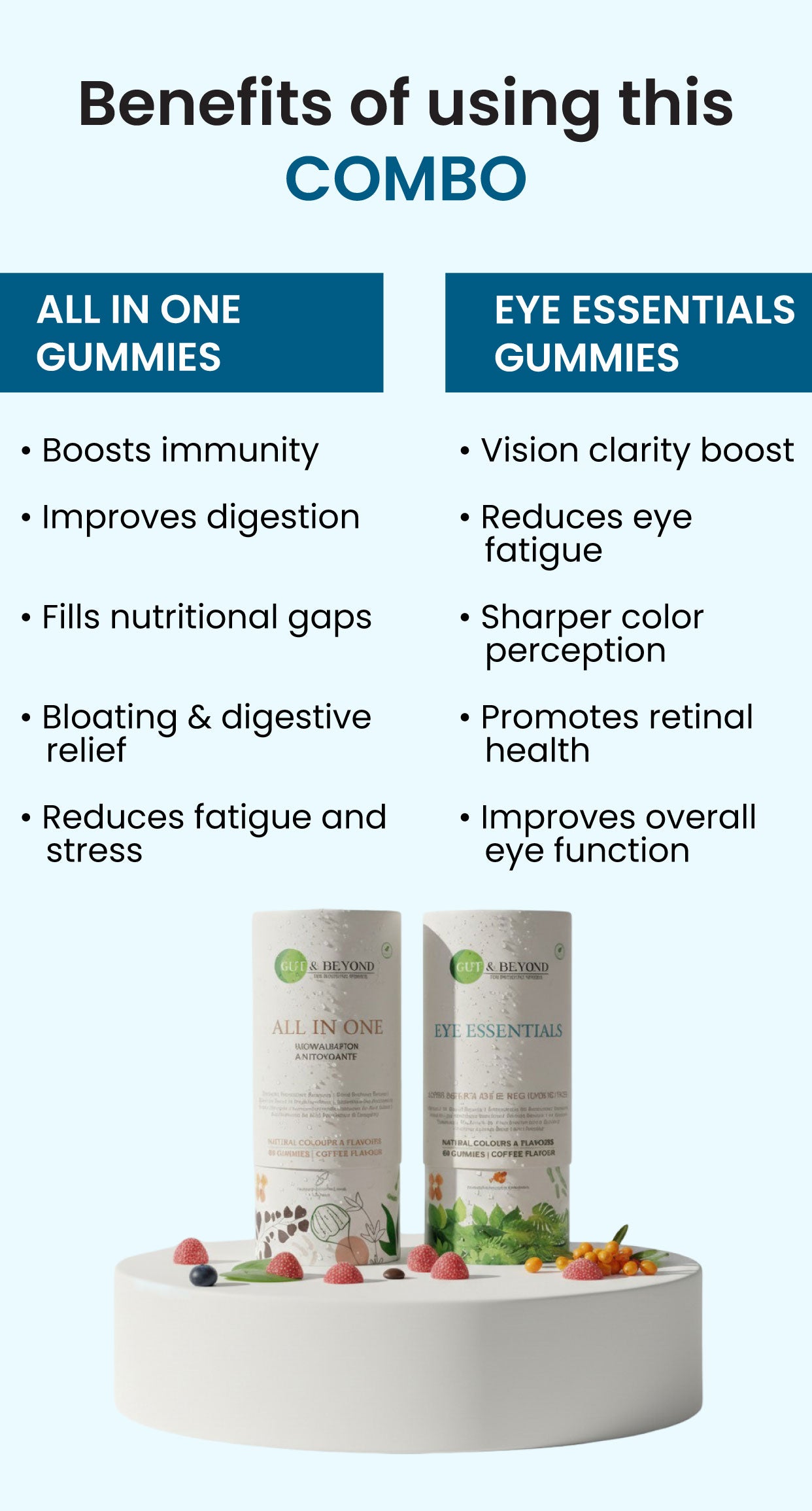 Elevate your daily health ritual with Gut and Beyondβs All-In-One + Eye Essentials Gummiesβa unique blend designed to energize your days, support healthy vision, and close common nutrient gaps.